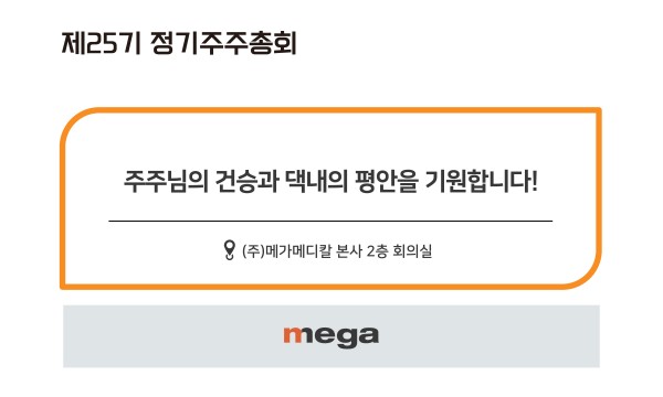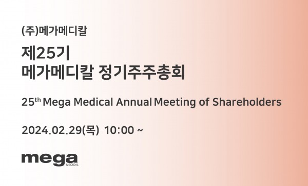 행사 : 제25기 메가메디칼 정기주주총회 장소 : (주)메가메디칼 본사 2층 회의실 일시 : 2024.02.29 부스번호 : N/A 링크 : https://www.megamedical.co.kr/kr/bbs/board.php?bo_table=m02_01&wr_id=17 주주님들의 건승과 댁내의 평안을 기원합니다!
